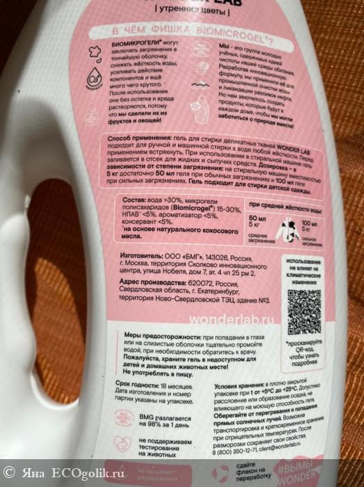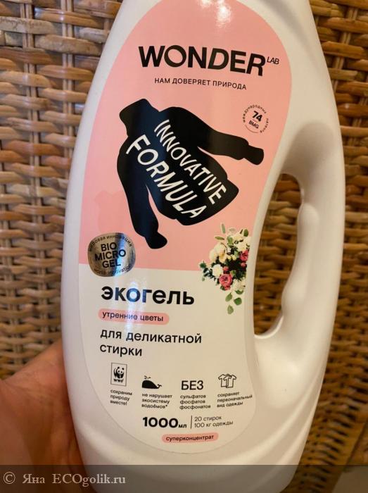 Среди тканей всегда отдаю предпочтение натуральным – они приятны коже, не вызывают раздражений и любых других негативных реакций. Плюсов в них намного больше, чем минусов. Но вот уход нужен соответствующий. Поэтому для стирки я выбираю экологичный гель с органическим составом Wonder Lab. Аромат выбираю «Утренние цветы». Он очень приятный и ненавязчивый, по консистенции густой.
