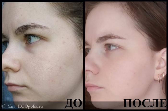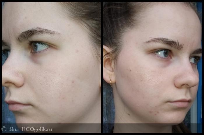 Из-за его цвета, кожа становится сатиновой и выравнивает тон кожи. Запах выветривается довольно быстро, Да и после 3-х недельного применения, к нему уже привыкаешь.