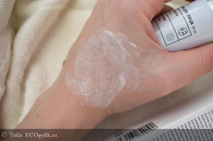 Крем средней плотности белого цвета. Очень хорошо распределяется по коже, впитывается быстро.