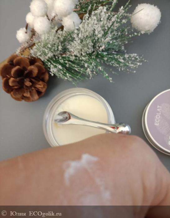 При соприкосновении с кожей твёрдое с виду масло начинает таять и легко распределяется по коже.