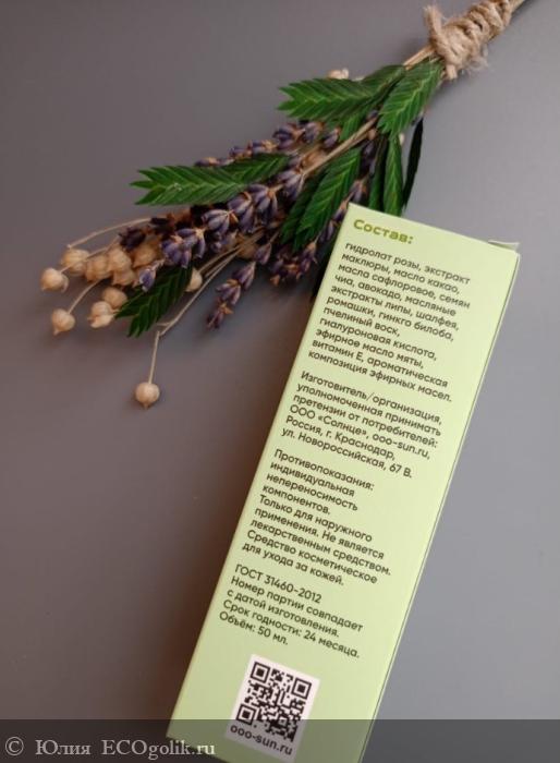 Так- же в состав входят гидролат розы, масло какао, масло сафлоровое, семена чиа , авокадо , масляные экстракты липы , шалфея , ромашки , гинкго билоба , пчелиный воск , гиалуроновая кислота , эфирное масло мяты , витамин Е , ароматическая композиция эфирных масел.
