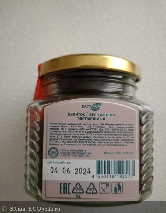 На этикетке представлена необходимая информация. Сторонники зож могут ознакомиться с энергетической ценностью продукта и составом. Хотя он состоит только из цикория, который стимулирует обменные процессы и способствует пищеварению и масла Гхи, которое насыщает организм витаминами и способствует укреплению иммунитета.