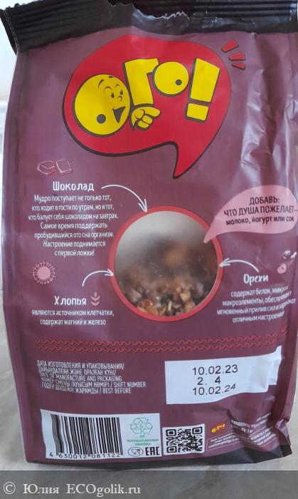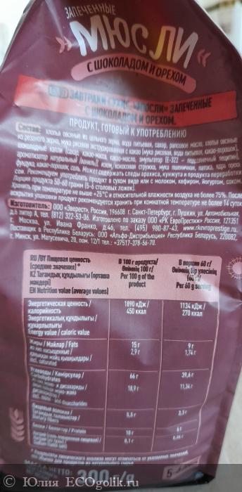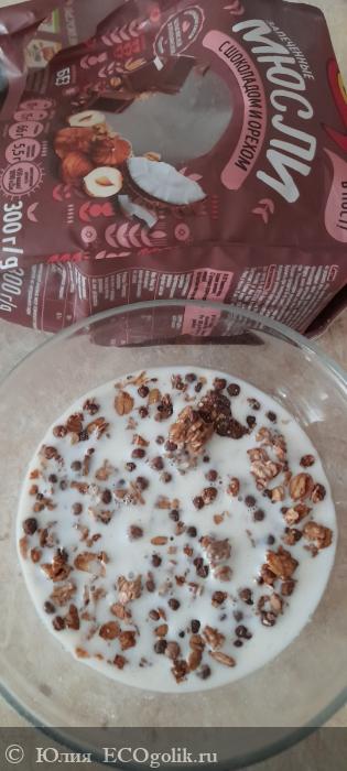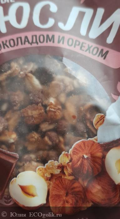 Продукт считается готовым к употреблению. Основные компоненты хлопья, орехи и шоколадные капли.