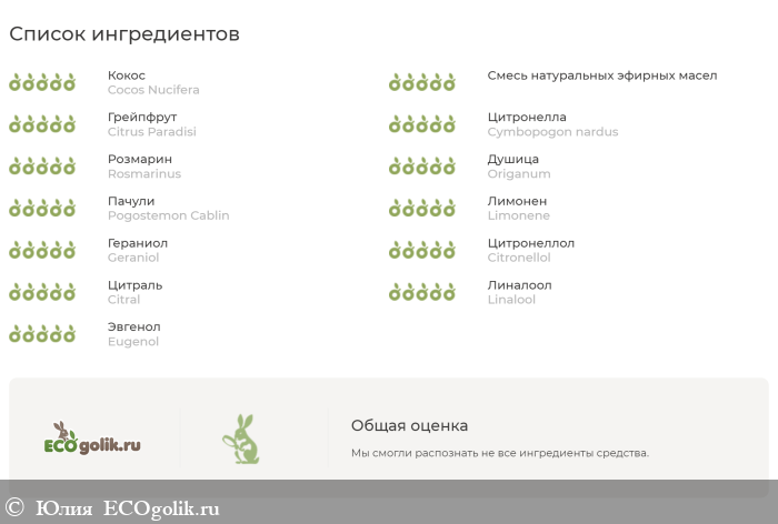 Фракционированное кокосовое масло; эфирные масла: грейпфрута, цитронеллы, розмарина, орегано, пачули; СО2-экстракт розмарина лекарственного; лимонен*, гераниол*, цитронеллол*, цитраль*, линалоол*, эвгенол*.