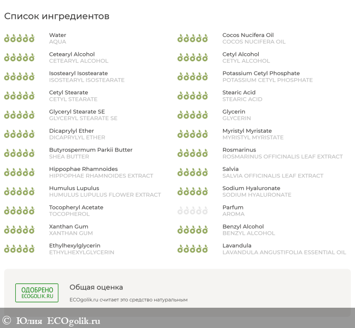 Результат анализа состава на Экоголике позитивный - все пятерки, кроме отдушки, которая не распознана