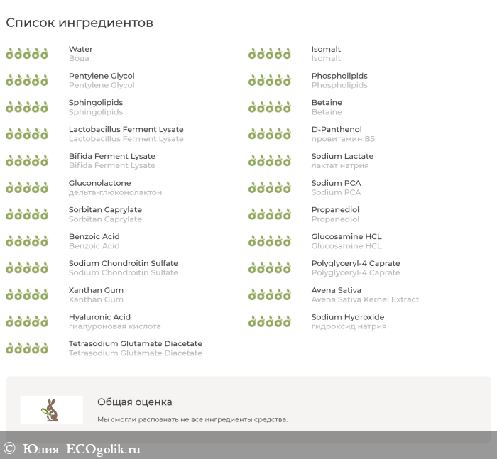 Результат анализа состава на Экоголике положительный - у всех компонентов (кроме двух нераспознанных) оценка 5: