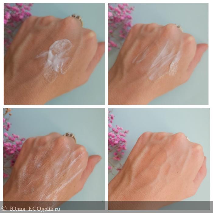 Распределяется по коже хорошо, но первоначально на ней остаются белые полосы. Я обычно массирую лицо примерно минуту-полторы и тогда они исчезают.