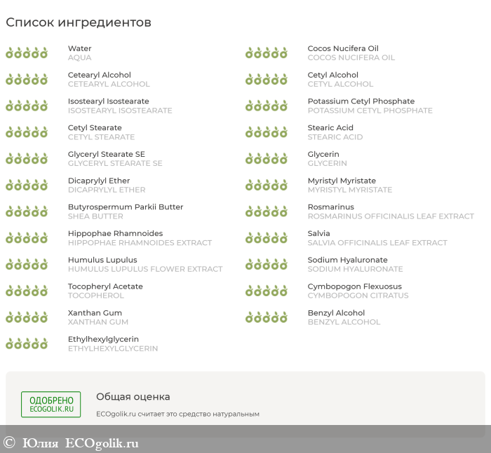 В составе крема содержатся масла кокоса и ши, которые известны своим питательным действием на кожу. Кроме этого, в составе присутствуют экстракты облепихи, шалфея, шишек хмеля и листьев розмарина.