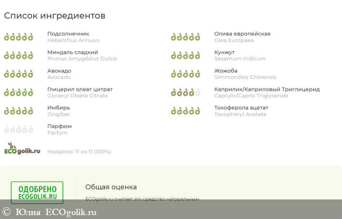 Смывается с кожи без проблем – после смывания не остается разводов от косметики и не появляется чувство сухости. Единственный нюанс – при смывании масло чуть-чуть пощипывает глаза.