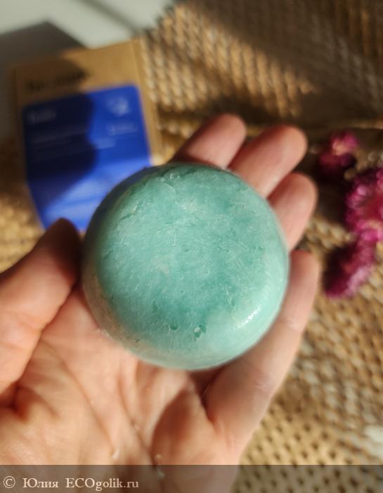Сам шампунь — это твердый брусок конусообразной формы серо-голубого цвета.