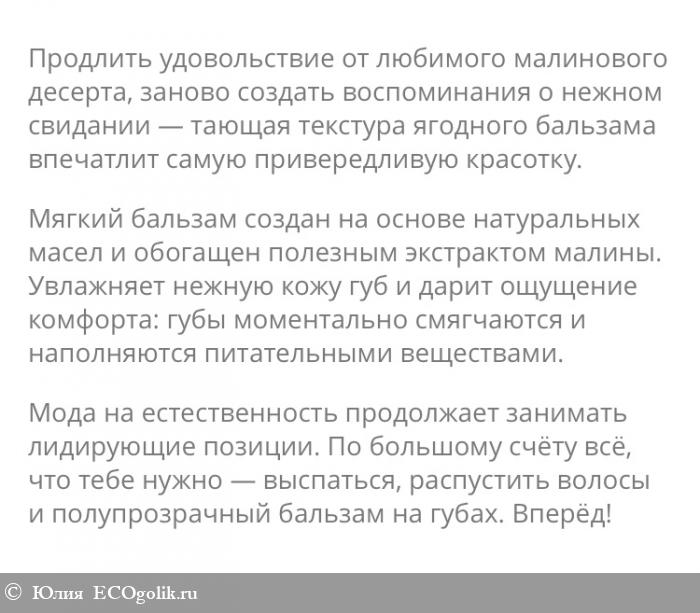 Ricinus Communis Seed Oil (Масло касторовое), Soy (soybean) wax (Воск соевый), Theobroma Cacao (Cocoa) Seed Butter (Масло какао), Butyrospermum Parkii Butter (Масло ши), Squalane (Сквалан), Cetyl Alcohol (Цетиловый спирт), Isoamyl Laurate (and) Isoamyl Cocoate (Растительный эмолент), Annatto (Краситель растительного происхождения), Aroma (Натуральная отдушка), Tocopherol (Витамин Е), Rubus idaeus L. extract (Экстракт малины).