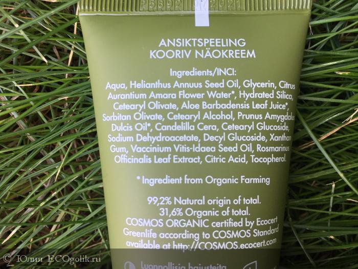 Скраб содержит увлажняющие кожу компоненты, в частности, миндальное масло, масло семян брусники и глицерин.Вода цветков апельсина обладает освежающим кожу и ухаживающим действием. Комплекс ухаживающих компонентов дополняет смягчающий и увлажняющий кожу экстракт алоэ.