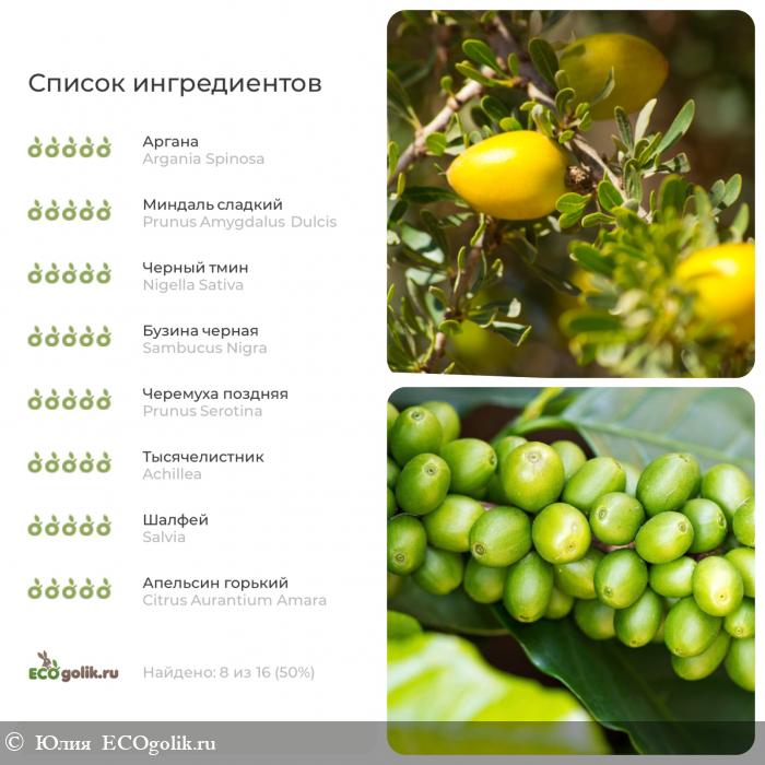 Формула средства сбалансирована по жирным кислотам, включает редкие ценные масла зеленого кофе, черного тмина, аргана, конопли, дыни, миндаля.