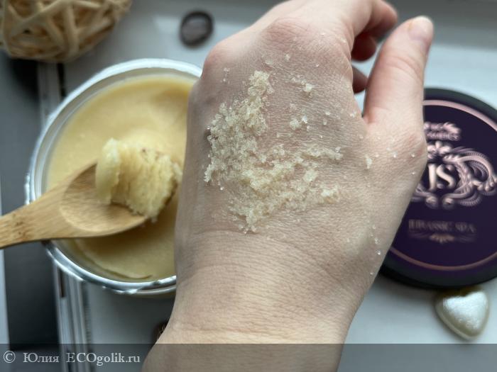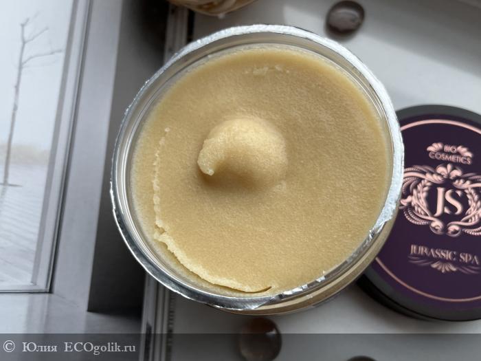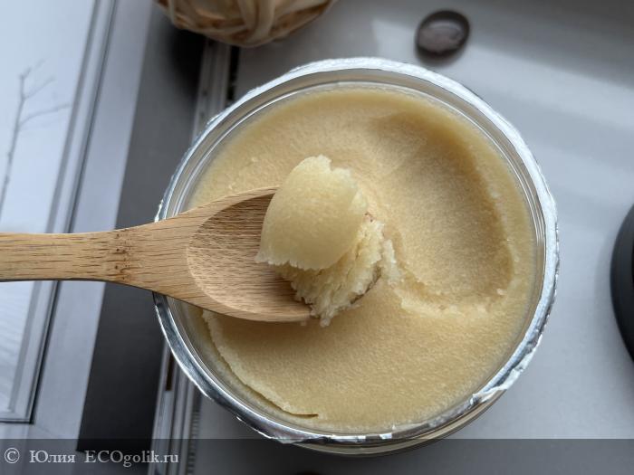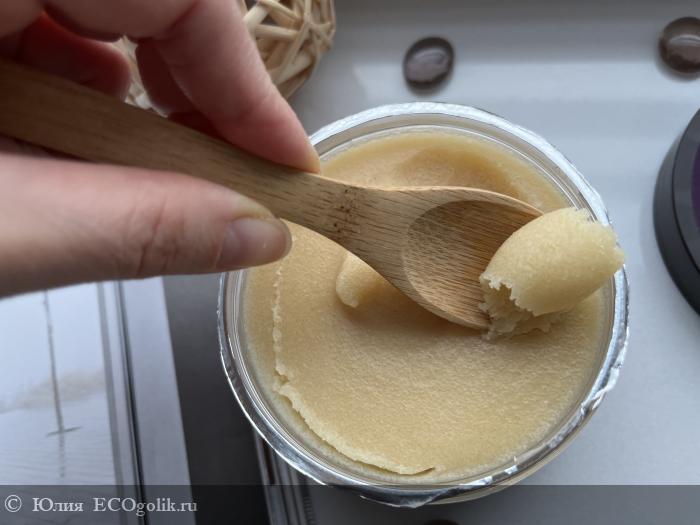 Скраб плотный, не маслянистый, желто-бежевого цвета. В нем много абразивных частиц - сахара.