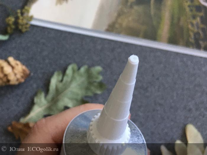 После вскрытия и прокола тюбика я надела конусовидный наконечник и срезала у него верхушку, чтобы появилось отверстие для подачи пилинга.