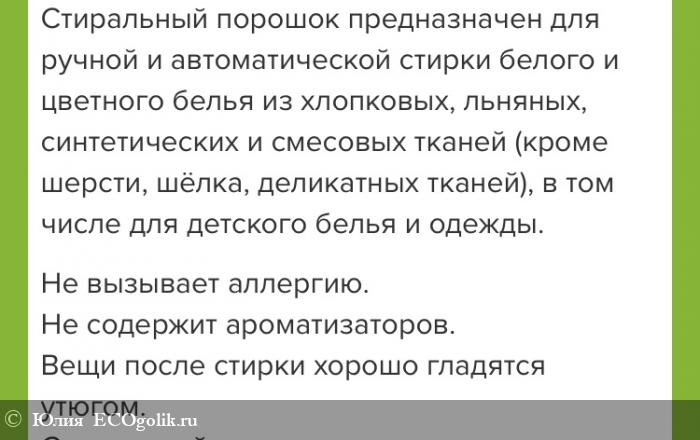 Ещё мне понравилось, что порошок полностью вымывается из ткани, не оставляет белёсых разводов (даже на темном комплекте постельного белья, который я обычно стирала жидким средством, поскольку порошки с него не вымывались).