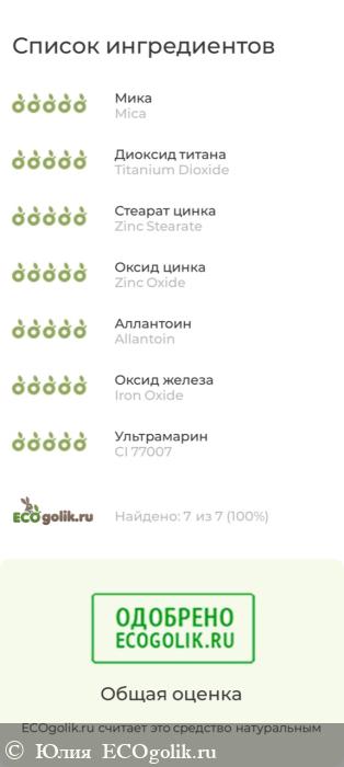 INCI: слюда, обработанная лауроил лизином (Mica CI 77019 treated with Lauroyl Lysine), диоксид титана (titanium dioxide CI 77891), стеарат цинка (Zinc Stearate), оксид цинка (ZINC OXIDE CI 77947), аллантоин (Allantoin), +- оксиды железа (Iron Oxide CI 77491, CI 77492), ультрамарины (Ultramarine Blue CI 77007)