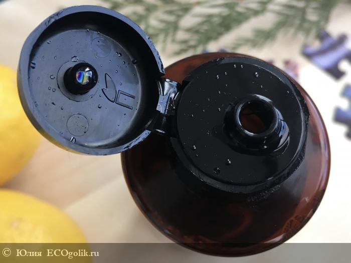 Упаковка: флакон из тёмного прозрачного пластика с откидной крышкой. Оформление флакона визуально мне нравится.