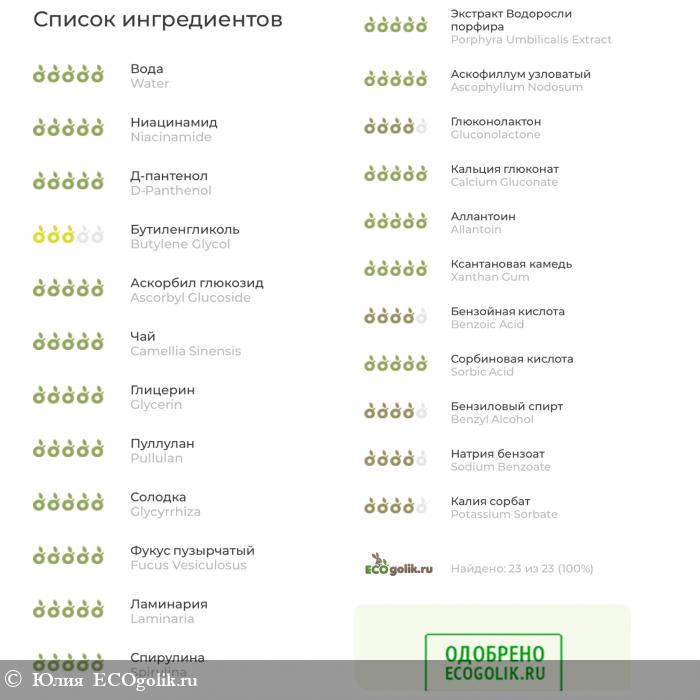 Состав: Aqua, Niacinamide (15%), D-Panthenol (5%), Butylene Glycol, Ascorbyl Glucoside (2%), Green Tea Extract, Glycerin, Pullulan, Licorice Extract, Fucus Vesiculosus Extract, Laminaria Digitata Extract, Spirulina Maxima Extract, Porphyra Umbilicalis Extract, Ascophyllum Nodosum Extract, Gluconolactone, Calcium Gluconate, Allantoin, Xanthan Gum, Benzoic Acid, Sorbic Acid, Benzyl Alcohol, Sodium Benzoate, Potassium Sorbate.