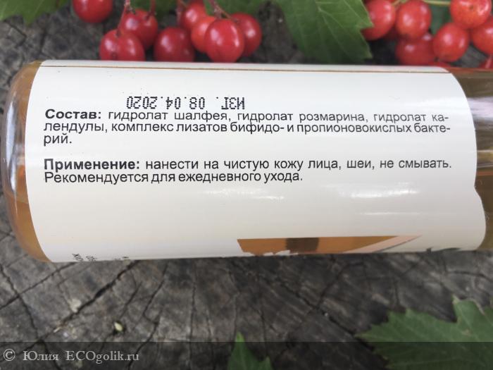 Состав: гидролат шалфея, гидролат розмарина, гидролат календулы, комплекс лизатов бифидо- и пропионовокислых бактерий.