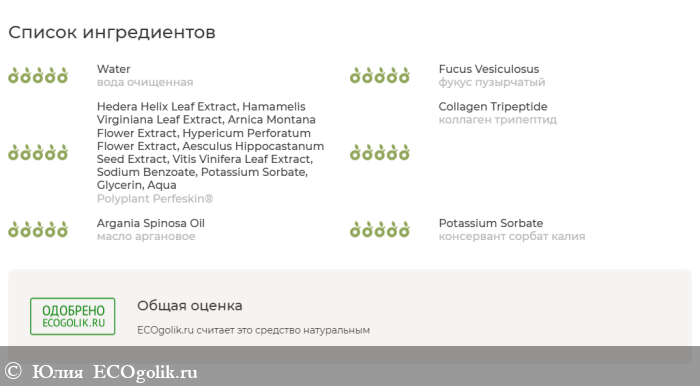 вода очищенная, фукус пузырчатый, Polyplant Perfeskin® (комплекс экстрактов арники, конского каштана, гамамелиса, плюща, зверобоя, виноградной лозы), коллаген трипептид, масло аргановое, консервант сорбат калия