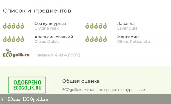 Все же на мой взгляд доминирует именно ЛАВАНДА, а эфирные масла апельсина и мандарина скорее ее подчеркивают.