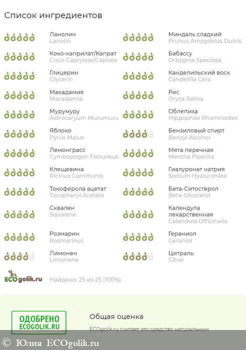 ланолин**, масло сладкого миндаля**, коко-каприлат**, масло бабассу**, глицерин**, воск канделильский**, масло макадамии**, воск рисовых отрубей**, масло мурумуру**, масло облепиховое**, экстракт яблока*, бензиловый спирт**, масло лемонграсса**, эфирное масло лемонграсса*, экстракт мяты*, масло клещевины**, гиалуронат натрия (низкомолекулярный)**, комплекс токоферолов**, бета-ситостерол**, сквален**, экстракт цветов календулы*, экстракт розмарина**, гераниол*, лимонен*, цитраль* * натуральные экстракты, масла и воски **компоненты с ECO и BIO сертификатами