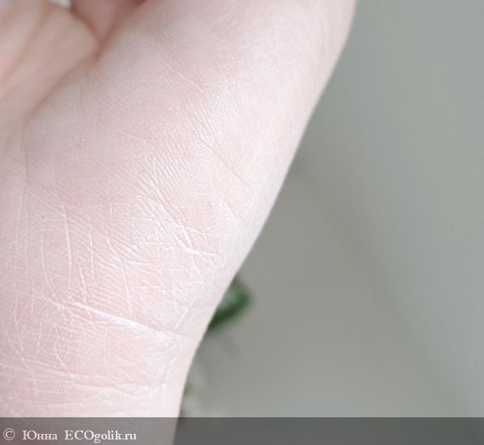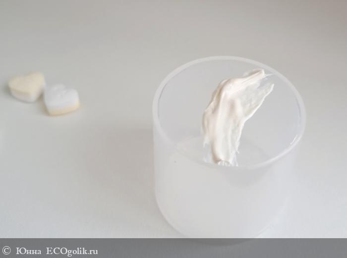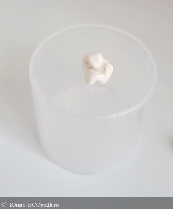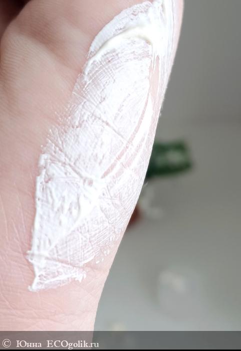 Текстура в меру густая, имеет белый цвет, легко распределяется и впитывается в течение 4-5 минут, это удобно при использовании как утром, так и вечером перед сном