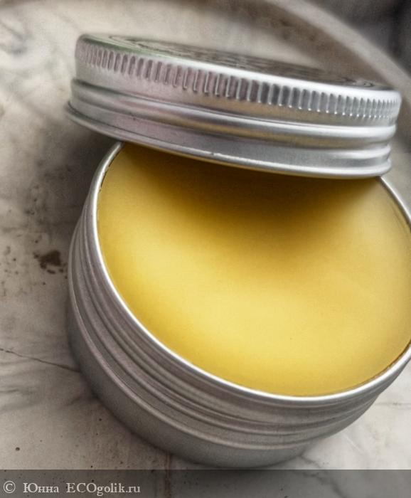 Сам бальзам желтого цвета и плотной консистенции с легким запахом трав