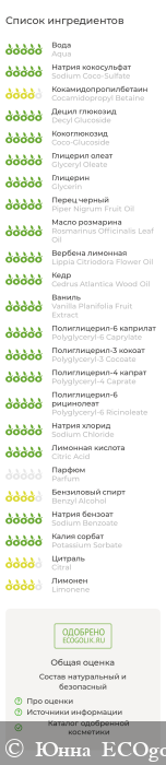 Состав INCI: Aqua (Вода), Sodium Coco-Sulfate (Натрия кокосульфат / ПАВ из кокосового масла, сертификат ECOCERT, разрешён по стандарту COSMOS для производства органической косметики), Cocamidopropyl Betaine (Кокамидопропилбетаин), Decyl Glucoside (Децилглюкозид), Coco-Glucoside (Кокоглюкозид), Glyceryl Oleate (Глицерил олеат), Glycerin (Глицерин), Piper Nigrum Fruit Oil (Эфирное масло чёрного перца), Rosmarinus Officinalis Leaf Oil (Эфирное масло розмарина), Lippia Citriodora Flower Oil (Эфирное масло вербены), Cedrus Atlantica Wood Oil (Эфирное масло кедра), Vanilla Planifolia Fruit Extract (Экстракт ванили), Polyglyceryl-6 Caprylate (and) Polyglyceryl-3 Cocoate (and) Polyglyceryl-4 Caprate (and) Polyglyceryl-6 Ricinoleate (Натуральный солюбилизатор), Sodium Chloride (Натрия хлорид), Citric Acid (Лимонная кислота), Parfum (Отдушка), Benzyl Alcohol, Sodium Benzoate, Potassium Sorbate (Бензиловый спирт, натрия бензоат, калия сорбат / консервант, разрешённый по стандарту COSMOS для производства органической косметики), Citral, Limonene (Компоненты эфирных масел).