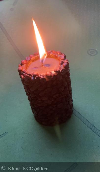 Свеча имеет большой обьем, высокий фитилек, а также прекрасный и стильный дизайн, свеча обклеена настоящими, крупными зернами кофе, и от этих зерен также исходит аромат кофе, даже без зажигания свечи