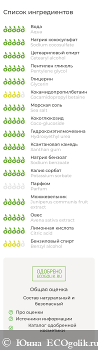 Aqua (вода дистиллированная), Sodium cocosulfate* (кокосульфат натрия), Cetearyl alcohol (цетилстеариловый спирт), Pentylene glycol** (пентилен гликоль), Glycerin (глицерин), Cocamidopropyl betaine (кокамидопропилбетаин), Sea salt (соль морская), Coco-glucoside (кокоглюкозид), Hydroxyethyl urea (гидроксиэтил мочевина), Xanthan gum (ксантановая камедь), Sodium benzoate (бензоат натрия), Potassium sorbate (сорбат калия), Parfum (отдушка), Juniperus communis fruit extract (экстракт можжевельника), Avena sativa extract (экстракт овса), Citric acid (лимонная кислота), Benzyl alcohol (бензиловый спирт)