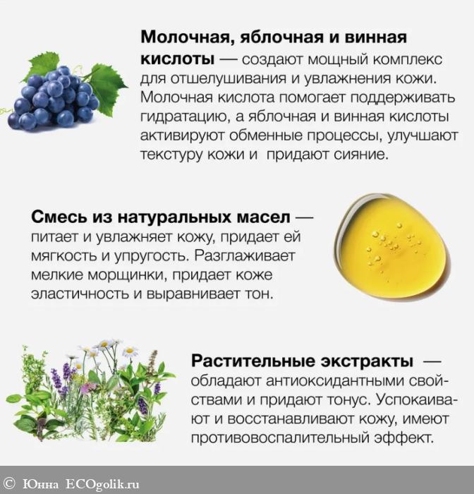 Молочная, яблочная и винная кислоты создают мощный комплекс для отшелушивания и увлажнения кожи. Молочная кислота помогает поддерживать гидратацию, а яблочная и винная кислоты активируют обменные процессы, улучшает текстуру кожи и придает сияние. Сочетание экстрактов вишни, кокоса, миндального и других натуральных масел питает и успокаивает кожу, а эфирные масла помогают усилить эффект.