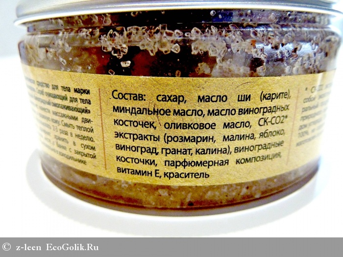 - виноградные косточки - оказывают очищающее воздействие. Поскольку в скрабе их немного (да и в составе они стоят в конце списка), то воздействие на кожу остается деликатным.