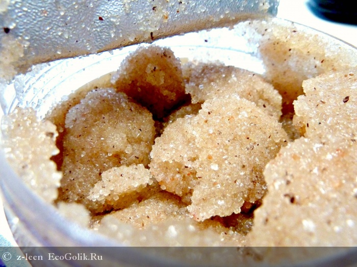 Скраб находится в пластиковом контейнере с закручивающейся крышкой, поэтому извлекать его стоит какой-нибудь ложечкой, чтобы лишняя влага не попала внутрь. Хотя я, если честно, так не делала! Доставала скраб руками будучи в душе, и, не смотря на это, никакого негативного воздействия не произошло. Так что для лентяечек - скраб не раскиснет и сохранит свой первозданный вид (если, конечно, не вылить в него ведро воды)
