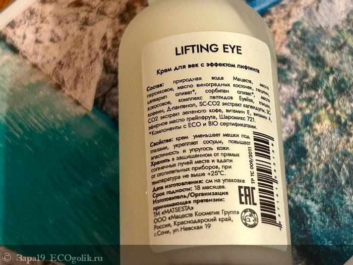 Сейчас я использую средство от бренда Matsesta. Это крем для век с эффектом лифтинга Lifting Eye.