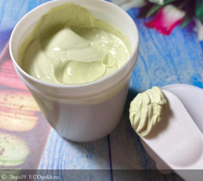Консистенция средства кремовая, текстура довольно плотная, но при этом маска легко распределяется по коже лица. Цвет светло-зеленый.
