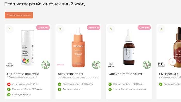 - Третий шаг: формируется рекомендуемый Уход за лицом, состоящий из пяти этапов, включающих 10 типов средств