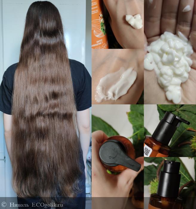 Кондиционер хранится во флаконе в объёме 200 мл. На нём есть изображение каштана. Флакончик оснащён помповым дозатором. Кондиционер имеет кремовую консистецию средней густоты белого цвета. В его аромате я чувствую в нём нотки иланг-иланга с эвкалиптово-кедровым шлейфом. Облегчает расчёсывание волос. Питает отлично. Увлажняет немного. Разглаживает неплохо. При этом сохраняя красивый завиток на кончиках. Слегка уплотняет шевелюру. Замечательно смягчает локоны, делая их послушными и блестящими. Если наносить на кожу голову ещё, то способствует росту волос и сокращению их выпадения, увеличит чуть объём и нормализует работу сальных желез. Не будет жирнить, утяжелять или влиять на частоту мытья волос. В составе: эмульгатор BTMS, масло брокколи, бетаин, гидролизованный протеин пшеницы, экстракты готу-колы и каштана, эфирные масла (иланг-иланга, кедра, эвкалипта), треонин, витамины B3, B5, B6, B7