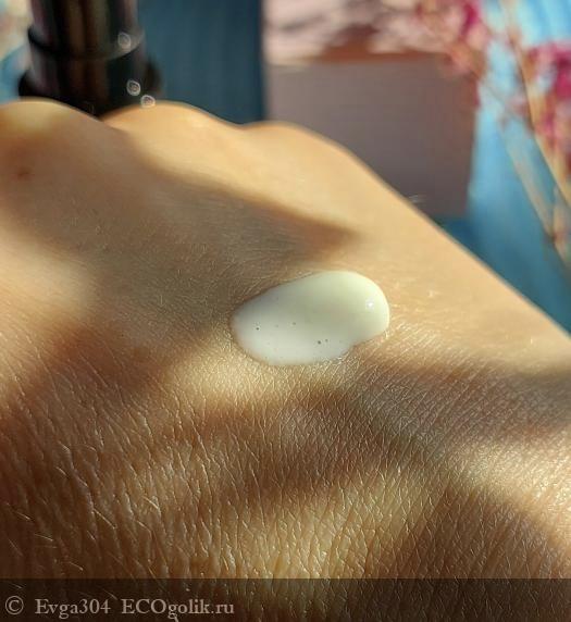 Крем белого цвета, с лёгким ароматом розы. Текстура плотная и нежная, не не жирная.
