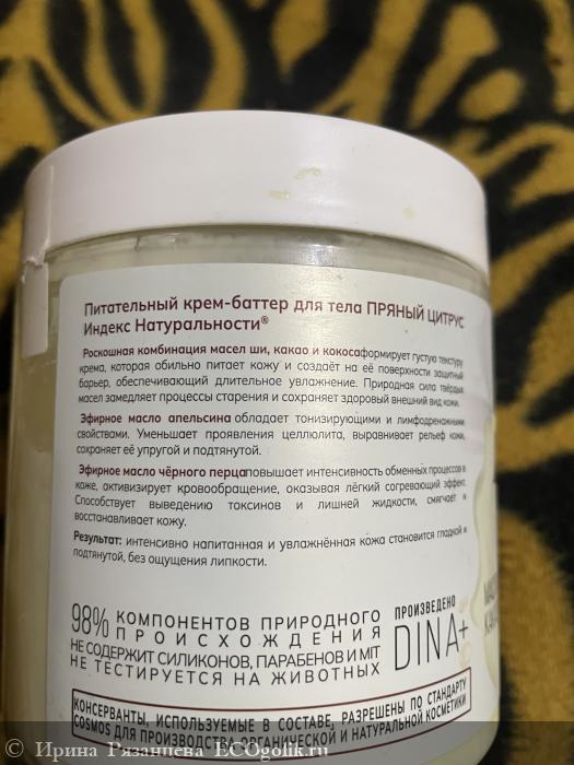 Друзья мои всем привет!Всем отличного настроения и приятного просмотра.Хочу поделиться отзывом на мое любимое средство.Речь пойдет о питательном крем-баттере с приятным ароматом пряный цитрус.Вот и наступила осень,а вместе с ней холода,ветер и проблемы с кожей.На улице холодно,в доме жарко,включили отопление,и от перепада температуры кожа сильно страдает:появляется сухость,зуд.Мое спасение-этот крем баттер!Это мое волшебное зелье с шикарным составом. Крем достаточно жирный, питательный, густой, с плотной текстурой. Но тает от соприкосновения с кожей...Прям,как сливочное масло и запах очень приятный.Очень хороший состав:присутствует масло ши,кокос,какао,а еще эфирное масло апельсина,черного перца.Результат виден с первого применения.Очень хорошо питает и смягчает кожу.У кого есть проблемы с пятками,сухость и трещины,спасает и вылечивает на раз,два,три.Проверено!Берите,не пожалеете.Очень рекомендую.