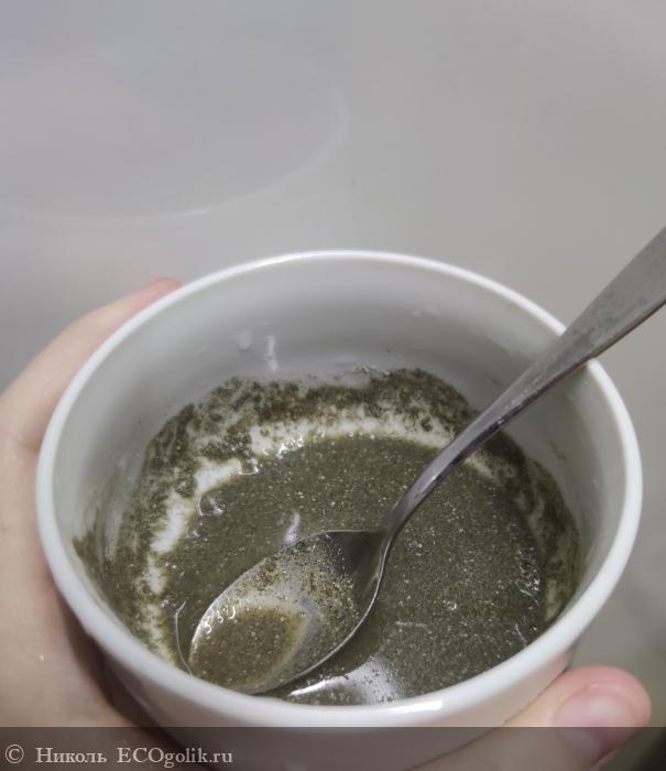 Примерно чайную ложку порошка смешиваю в ладони с тёплой водой до состояния густой кашицы. Он не царапает кожу, не вызывает покраснений или жжения.