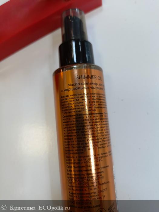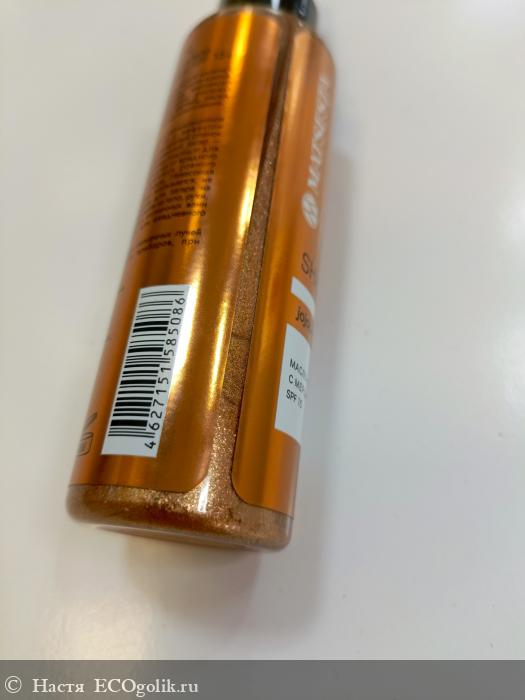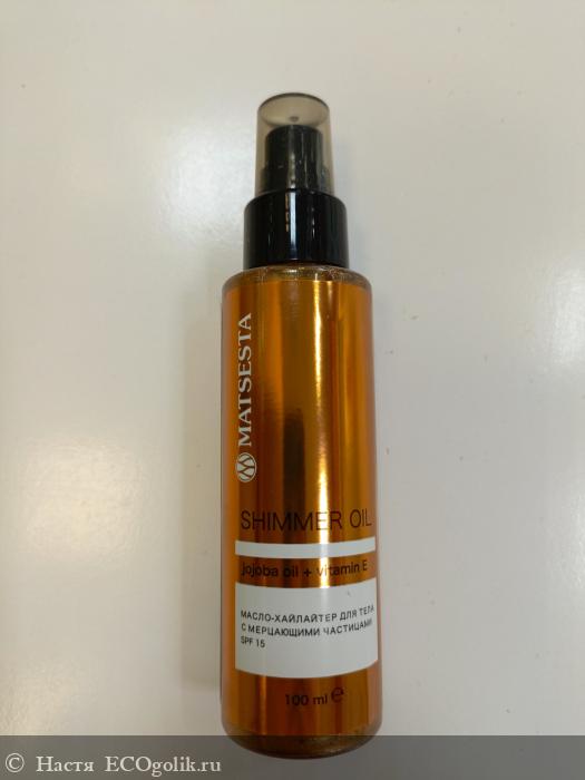 Масло-хайлайтер для тела с мерцающими частицами SPF 15+ от бренда MATSESTA - мой летний помощник для красивой кожи Классное средство для мгновенного сияния, , загара, ухода и защиты кожи от солнца На дне бутылки есть информация о дате изготовления Упаковка из пластика , удобный плавный дозатор , выдавливает бережно, не разбрызгивая средство Перед применением нужно как следует растрясти бутылочку...