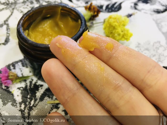 Тяжелая артиллерия для уставших и сухих рук! Очень пригодится огородникам, при аномальной сухости рук, от надоевших заусенцев и наждачных локтей. Текстура средства — будто сгущенка из янтаря, аромат хвойно-смолистый, согревающий. Рекомендуется наносить на мокрые руки, можно сбрызнуть гидролатом или после ванны или мытья рук нанести. Бальзам словно тает и захватывает воду, усаживаясь на коже. Почему-то остаётся пудровый финиш, руки не липкие. Отлично заживляет руки, по сравнению с кремами от Удумбары тут повышенная концентрация заживляющих смол. Рекомендую наносить на ночь как маску для рук, так можно быстро привести кожу в порядок. Расход мегаэкономный, по горошинке за применение. Аромат чудесный, словно переносит в хвойный лес, залитый солнечными лучами.