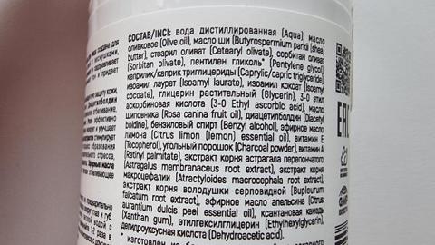 Состав: Aqua (вода дистиллированная), Olive oil (масло оливковое), Butyrospermum parkii (shea) butter (масло ши), Cetearyl olivate (стеарил оливат), Sorbitan olivate (сорбитан оливат), Pentylene glycol* (пентилен гликоль), Caprylic/capric triglyceride (каприлик/каприк триглицериды), Coco-caprylate/caprate (коко-каприлат/капрат), Glycerin (глицерин), 3-0 Ethyl ascorbic acid (3-0 этил аскорбиновая кислота), Rosa canina fruit oil (масло шиповника), Alpha-arbutin (альфа-арбутин), Benzyl alcohol (бензиловый спирт), Citrus limon (lemon) essential oil (эфирное масло лимона), Tocopheryl acetate (витамин Е), Charcoal powder (угольный порошок), Retinyl palmitate (витамин А), Astragalus membranaceus root extract (экстракт корня астрагала перепончатого), Atractylodes macrocephala root extract (экстракт корня макроцефалии), Bupleurum falcatum root extract (экстракт корня володушки серповидной), Citrus aurantium dulcis peel essential oil (эфирное масло апельсина), Xanthan gum (ксантановая камедь), Ethylhexylglycerin (этилгексилглицерин), Dehydroacetic acid (дегидроуксусная кислота).