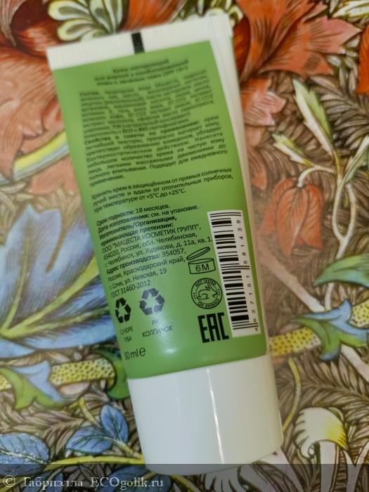 В составе природная вода Мацеста, гидролат зеленого чая, масло виноградных косточек, лецитин (растительный), масло касторовое, масло аргановое, азелаиновая кислота, цинк, витамин Е, гель алоэ вера, экстракт зеленого кофе, экстракт хмеля, экстракт чистотела, эфирное масло лемонграсса (им и пахнет слегка крем).