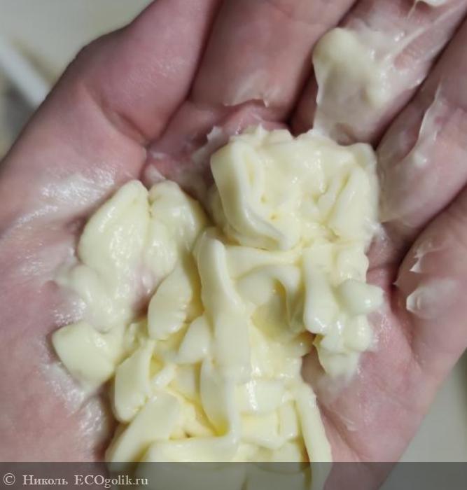 Аромат у неё приятный, облепиховый, ещё я чувствую нотки апельсина, а в шлейфе ощущаю ноты жасмина. Консистенция у маски густая и плотная, она однородной кремовой текстуры лимонного оттенка. По волосам легко распределяется и быстро с них смывается.