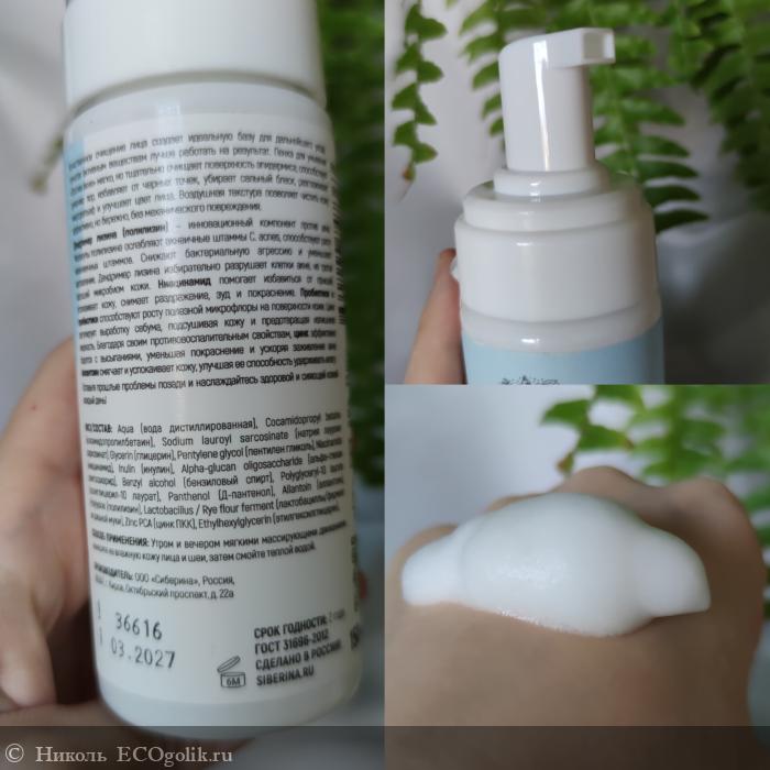 Пенка хранится во флаконе, сделанном из полиэтилентерефталата, в объёме 150 мл. Имеет симпатичный дизайн. Флакон оснащён помповым дозатором. Он закрывается прозрачной крышечкой. Пенка воздушная, нежная, пышная, белого цвета, хорошо держит свою форму. Имеет приятный, ненавязчивый, свежий аромат, который не остаётся на лице и шеи после её смывания. Имеет pH 5,5. Этот уходовый продукт легко распределяется по лицу и быстро смывается. Не оставляет после себя чувство стянутости, ощущение неприятной скользкости, не вызывает покраснение, раздражение. Имеет экономичный расход и хороший состав. Мягко очищает. Обеспечивает бережное очищение. Не сушит кожу. Смягчает. Устраняет жирный/сальный блеск. Увлажняет. Обладает противовоспалительным действием. Поддерживает здоровый микробиом кожи. Способствует сужению пор, улучшению цвета лица, разглаживанию микрорельефа. Успокаивает. Смывает лёгкий макияж. Уменьшает количество высыпаний. Помогает в борьбе с высыпаниями, прыщами, акне, чёрными точками.