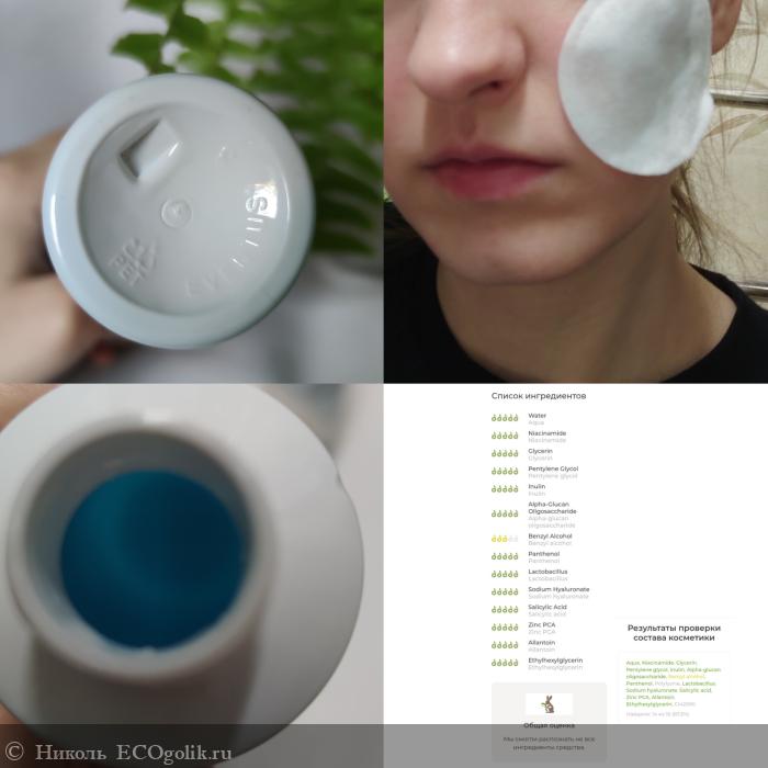 Тоник хранится во флаконе, сделанном из полиэтилентерефталата, в объёме 200 мл. Дизайн флакончика минималистичный. Флакончик оснащён удобной крышкой флип-топ. У тоника жидкая, текучая консистеция голубого цвета. На цвет лица никак не влияет. Расходуется экономично. После его использования нет липкости. Он имеет лёгкий, свежий аромат. В составе: ниацинамид, глицерин, инулин, альфа-глюкан олигосахарид, полилизин, д-пантенол, цинк, лактобациллы, салициловая кислота, гиалуронат натрия, аллантоин. Превосходно убирает жирный блеск. Хорошо, мягко и бережно очищает, не пересушивая кожицу. Прекрасно избавляет от чувства стянутости. Можно использовать не только для лица, но и для тела. Подготавливает кожу к более глубокому восприятию активов последующих уходовых средств. Способствует сужению пор. Отлично регулирует выработку кожного сала. Быстро успокаивает кожу. Хорошо снимает покраснения и раздражение. Замечательно увлажняет. Ощутимо смягчает. Предотвращает появление прыщей, акне.