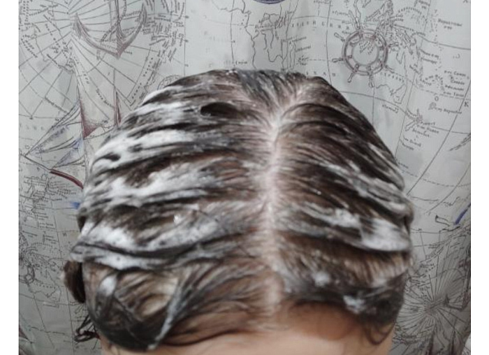 Пилинг прозрачного цвета, гелевый текстуры, не растекается во время нанесения. Наношу на волосы до мытья головы по проборам. Пенится при распределении и легко смывается шампунем.